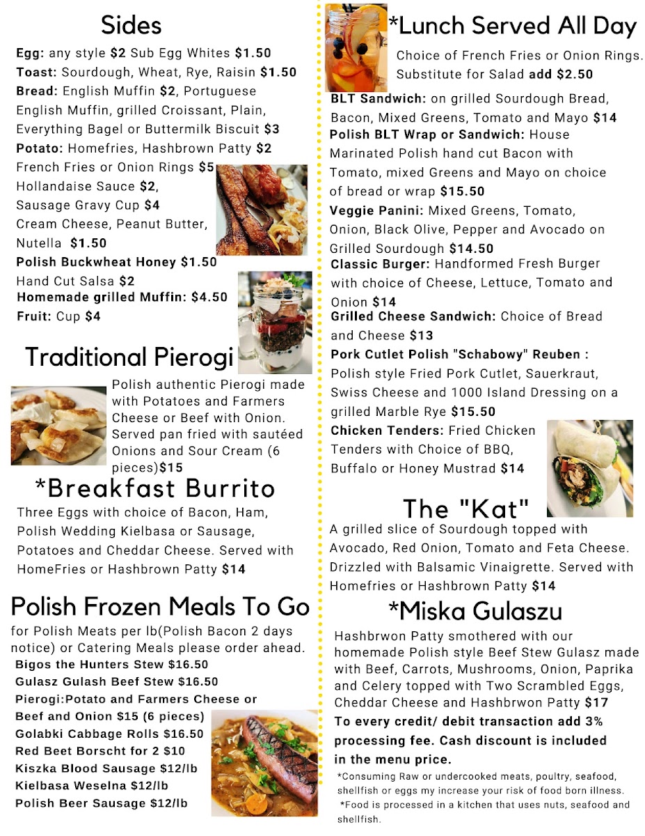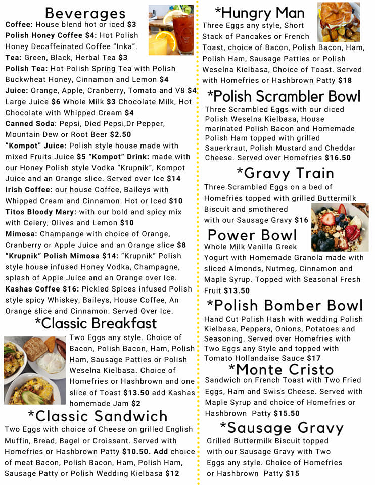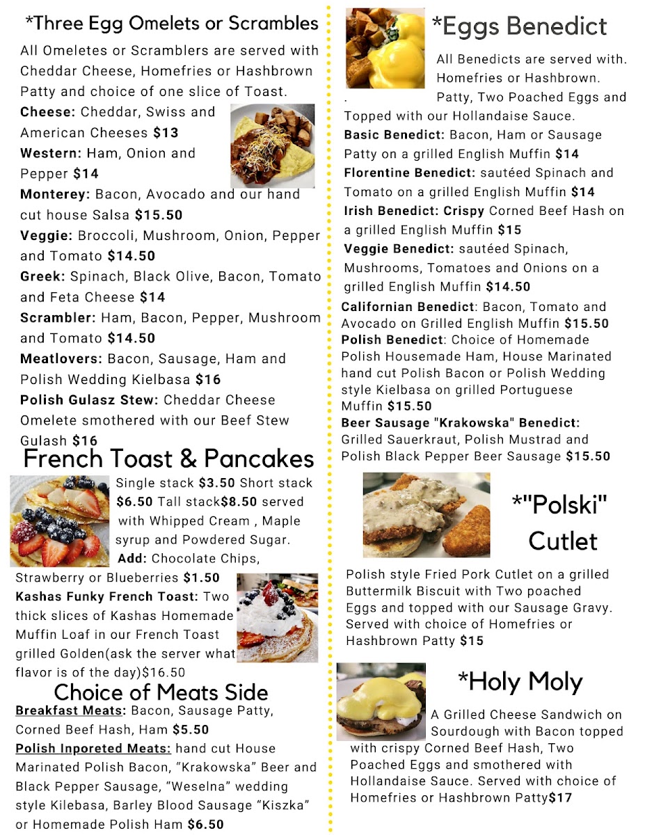 3 Eggs any style, short stack of Pancake or French Toast, choice of Bacon, Polish Bacon,Ham, Polish Ham, Sausage or Kielbasa. Choice of Toast. Served with Homefries or Hashbrown